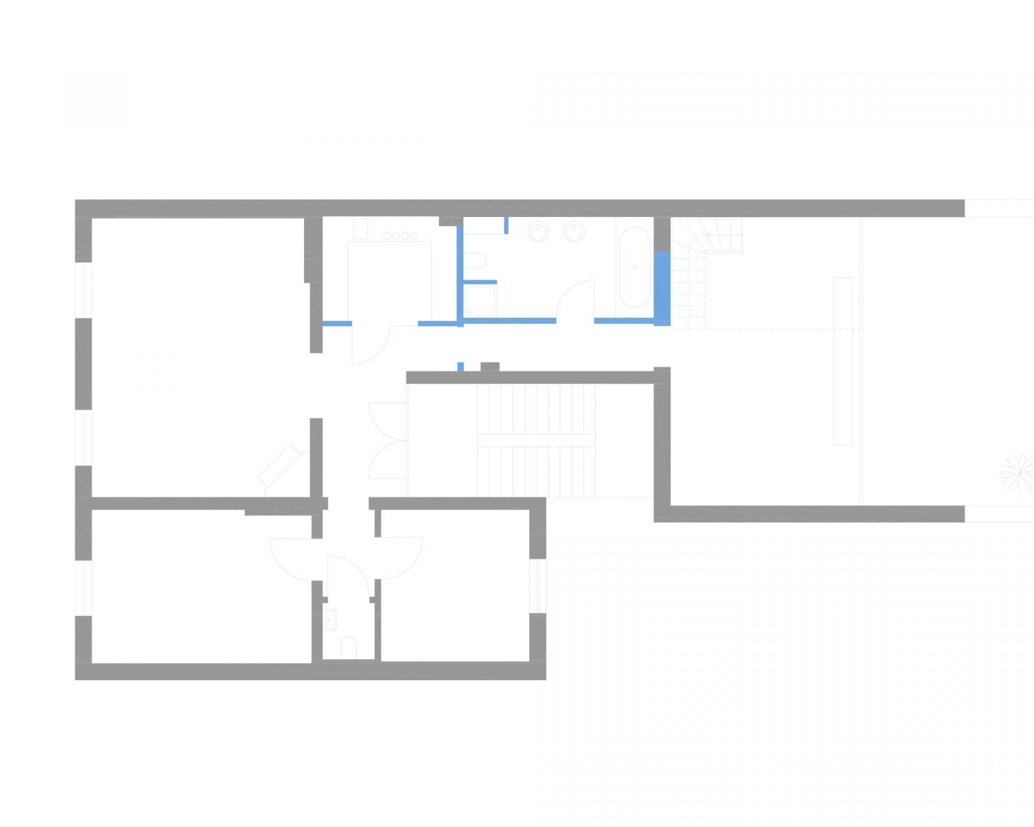 Daher wurde dieser Teil der Wohnung entkernt. Die Lage von Bad und Küche getauscht. Die Treppe auf die Empore wurde so verlegt, dass die Küche zum Terrassenzimmer geöffnet werden konnte. Durch die Verkleinerung des Badezimmers konnte zusätzlich ein Abstellraum und eine Einbaugarderobe geschaffen werden.